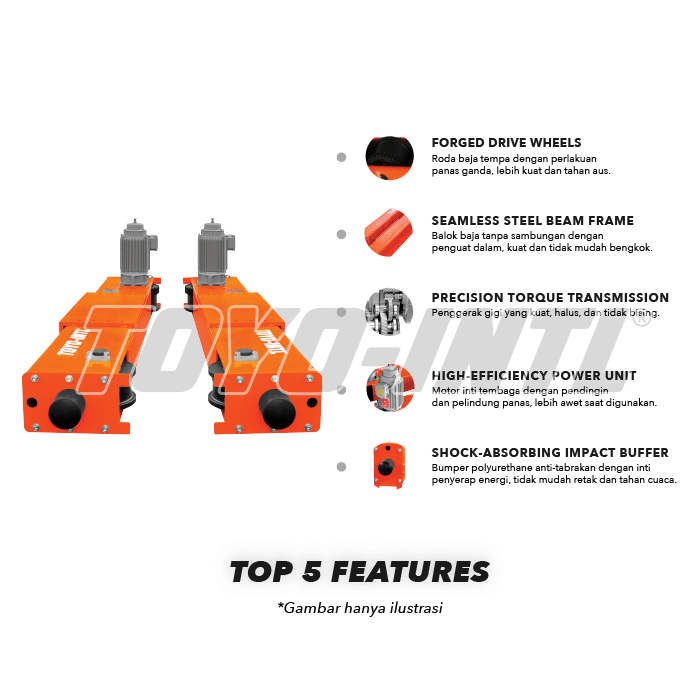 End carriage overhead crane dilengkapi dengan fitur yang memudahkan operasional di berbagai sektor industri. Fitur utamanya adalah: