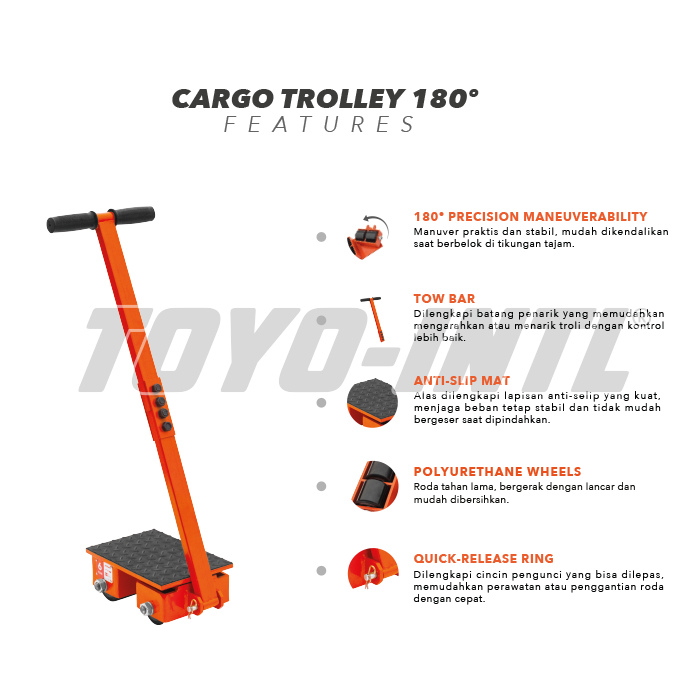 Situs seperti yang menyediakan produk Toyo misalnya model Cargo Trolley Toyo 180 Degree 6 T + Handle menawarkan spesifikasi yang sangat tepat untuk kebutuhan industri berat. Produk ini memiliki kapasitas beban hingga ±6 ton (6 T), menggunakan desain 180 degree yang memungkinkan manuver lebih fleksibel, dilengkapi handle untuk kontrol yang lebih baik.